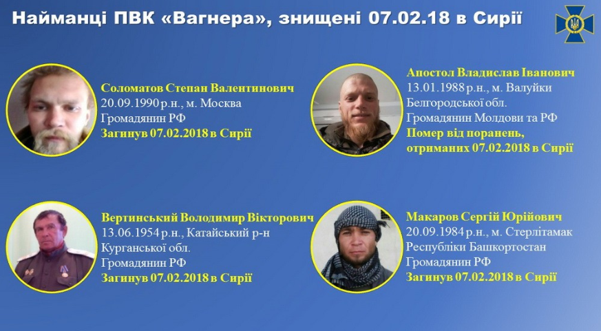 По данным СБУ, в числе погибших есть иностранные граждане, опубликованы также групповые фото "Вагнера" накануне уничтожения в Сирии. В списке указаны фамилии 8 граждан России, а также одного украинца. Все они, по данным СБУ, принимали участие в боевых действиях на востоке Украины в составе незаконных вооруженных формирований (НВФ).