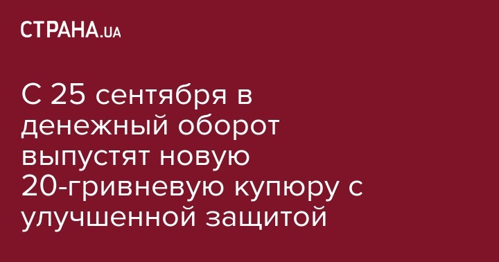 С 25 сентября украинцы начнут пользоваться новой банкнотой номиналом 20 грн, которыми постепенно заменят изношенные купюры образца 2003 года. Об этом сообщает пресс-служба НБУ.