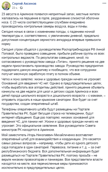 "Теперь о ситуации с кислотонакопителем, в который сбрасывают химические отходы с 1971 года. Площадь этого "озера" – 42 квадратных километра, объем – 30 миллионов кубометров воды. Накопитель впервые высох до такой степени. Никаких диверсий не было. Причина образования конденсата – в перепаде ночных и дневных температур. Концентрация превысила допустимые нормы только в ночное время", - заявил руководитель аннексированного Крыма Сергей Аксенов.