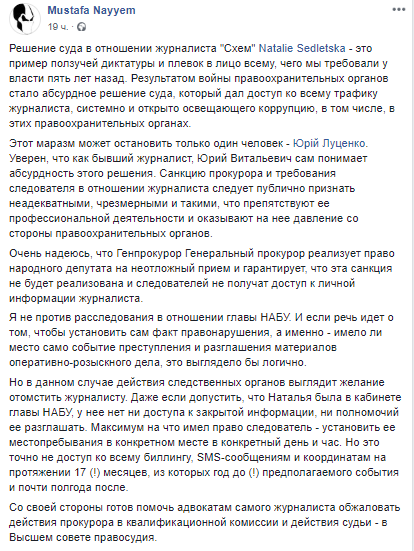 "Результатом войны правоохранительных органов стало абсурдное решение суда, который дал доступ ко всему трафику журналиста, системно и открыто освещающего коррупцию, в том числе, в этих правоохранительных органах. Этот маразм может остановить только один человек - Юрий Луценко. Уверен, что как бывший журналист, Юрий Витальевич сам понимает абсурдность этого решения. Санкцию прокурора и требования следователя в отношении журналиста следует публично признать неадекватными, чрезмерными и такими, что препятствуют ее профессиональной деятельности и оказывают на нее давление со стороны правоохранительных органов", - написал на своей станице в Facebook депутат.