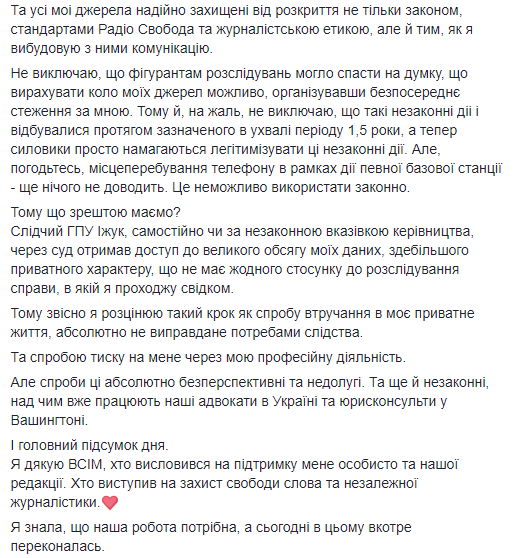 После того, как разгорелся скандал, спикер Генпрокуратуры Андрей Лысенко пояснил, что получение данных от мобильного оператора за 17 месяцев - это не вмешательство в профессиональную или личную жизнь. Кроме того, по его словам, в ГПУ не будут изучать содержание смс, а журналистку не поставят на прослушку. А все, что нужно Генпрокуратуре - данные о геолокации.