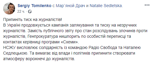 Глава Национального союза журналистов Украины Сергей Томиленко призвал прекратить давление на журналистов давление на журналистов. "В Украине продолжается кампания запугивания и давления на неудобных журналистов. Вместо публичного отчета о состоянии расследований преступлений против журналистов, Генпрокуратура рыщет по личной переписке и контактам руководителя программы "Схемы", - написал он в Facebook и потребовал от власти и политиков прекратить создавать атмосферу вражды к журналистам.