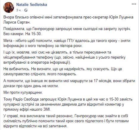 В тот же день, около полуночи Наталье Седлецкой позвонила пресс-секретарь Юрия Луценко Лариса Сарган и пригласила журналистку на закрытую встречу без камеры с генпрокурором, которая должна была пройти в 15:30 5 сентября.