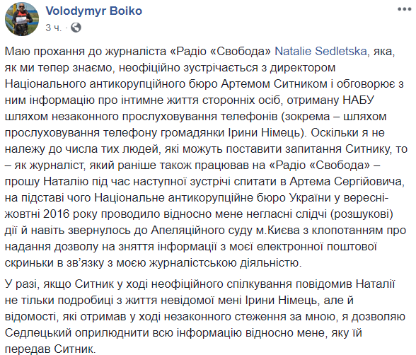 "Имею просьбу к журналисту "Радио "Свобода"" Natalie Sedletska, которая, как мы теперь знаем, неофициально встречается с директором Национального антикоррупционного бюро Артемом Сытником и обсуждает с ним информацию об интимной жизни посторонних лиц, полученную НАБУ путем незаконного прослушивания телефонов (в частности - путем прослушивания телефона гражданки Ирины Немец). Поскольку я не принадлежу к числу тех людей, которые могут задать вопрос Сытнику, то - как журналист, ранее также работал на Радио "Свобода" - прошу Наталью во время следующей встречи спросить у Артема Сергеевича, на основании чего Национальное антикоррупционное бюро Украины в сентябре-