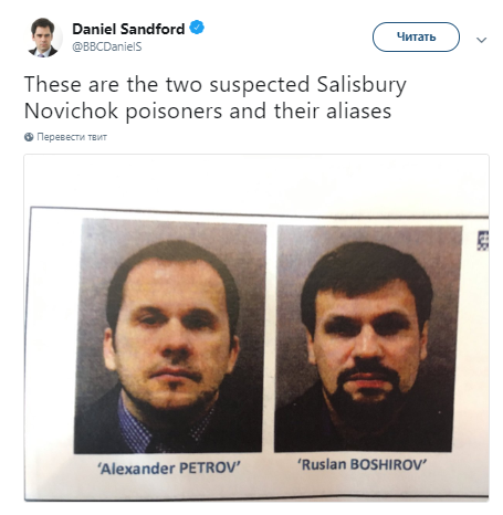 Обвинения по делу об отравлении экс-полковника ГРУ Сергея Скрипаля и его дочери Юлии предъявлены гражданам России Александру Петрову и Руслану Боширову. Об этом заявила британская прокуратура, сообщает в своем микроблоге в Тwitter корреспондент BBC News Дэниел Сэнфорд.