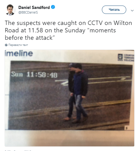 В сообщении говорится, что одозреваемые были сняты на камеры видеонаблюдения на Уилтон-роуд в 11:58 в воскресенье непосредственно перед тем, как было совершено покушение на Скрипалей.