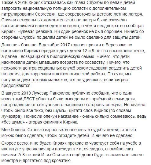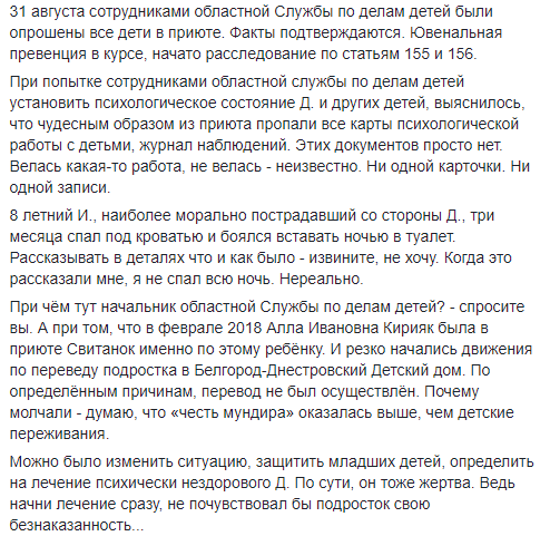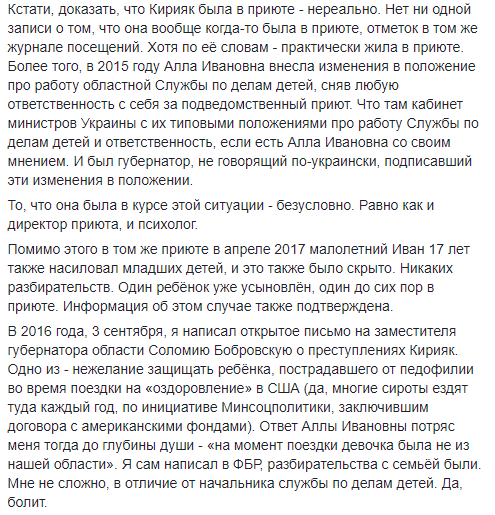 "Кстати, доказать, что Кирияк была в приюте - нереально. Нет ни одной записи о том, что она вообще когда-то была в приюте, отметок в том же журнале посещений. Хотя по её словам - практически жила в приюте. Более того, в 2015 году Алла Ивановна внесла изменения в положение про работу областной Службы по делам детей, сняв любую ответственность с себя за подведомственный приют", - рассказал советник.