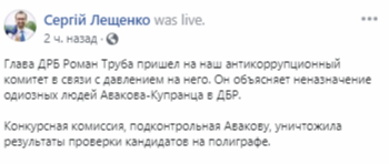 Лещенко пишет, что конкурсная комиссия, подконтрольная Авакову, уничтожила результаты проверки кандидатов ГБР на полиграфе.