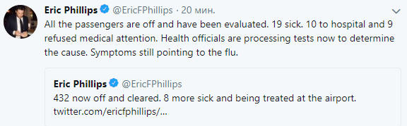 "10 заболевших человек сошли с самолета и направляются в Jamaica Hospital. Медработники по одному выводят остальных и проверяют их на симптомы заболевания", - написал он в Twitter.