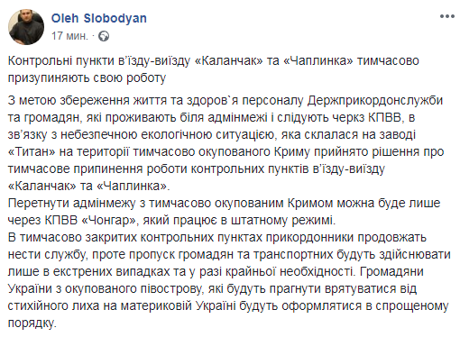 "С целью сохранения жизни и здоровья персонала Госпогранслужбы и граждан, проживающих у админграницы и следующих через КПВВ, в связи с опасной экологической ситуацией, сложившейся на заводе "Титан" на территории временно оккупированного Крыма принято решение о временном прекращении работы контрольных пунктов въезда-выезда "Каланчак" и "Чаплинка". Пересечь админграницу с временно оккупированным Крымом можно будет только через КПВВ "Чонгар", который работает в штатном режиме", - написал он на странице в Фейсбуке.