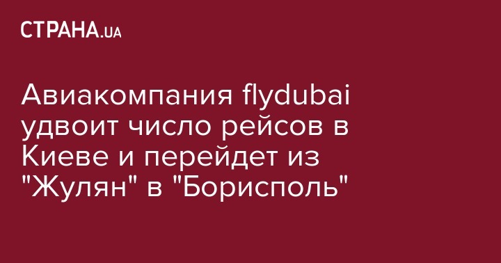 Авиакомпания Flydubai, в настоящее время выполняющая рейсы из Дубая (ОАЭ) в аэропорт "Киев" им. Сикорского (Жуляны), с 28 октября переведет их в аэропорт "Борисполь". "Украина остается важным рынком для компании. Со 2 октября ежедневно будут доступны по два рейса между Киевом и Дубаем", – говорится в сообщении компании на ее сайте, передает "Интерфакс-Украина".
