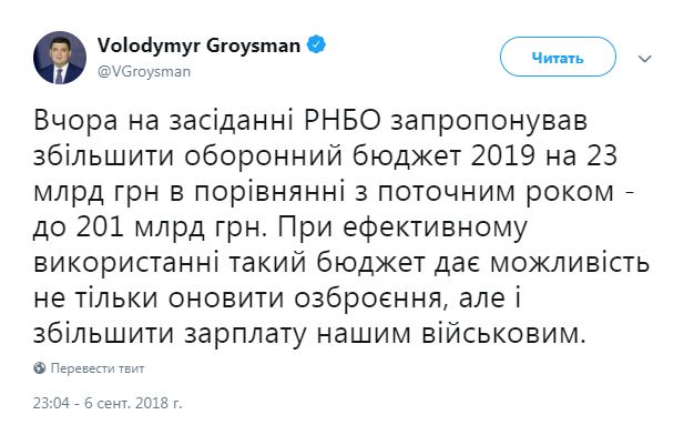 Премьер-министр Владимир Гройсман заявил, что военный бюджет Украины в 2019 году вырастет на 23 миллиарда гривен и составит сумму в 201 миллиард гривен. Об этом сообщил премьер-министр Владимир Гройсман в Twiiter 7 сентября.