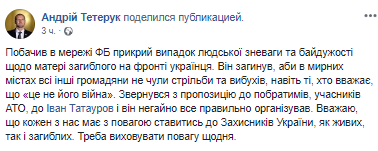 "Считаю, что каждый из нас должен с уважением относиться к Защитникам Украины, как живых, так и погибших. Надо воспитывать уважение ежедневно", - написал в соцсети Тетерук.