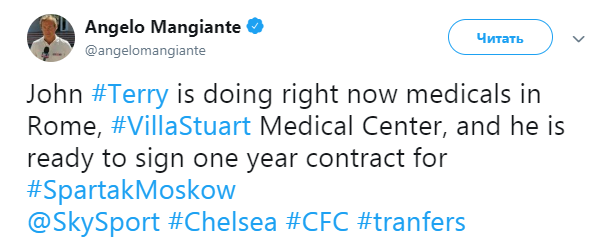 Сейчас английский защитник пребывает в статусе свободного агента и может продолжить карьеру в России. Терри отмечает, что 37-летний спортсмен проходит медицинское обследование перед переходом в российский клуб. По его словам, что "Спартак" заключит с англичанином однолетний контракт.