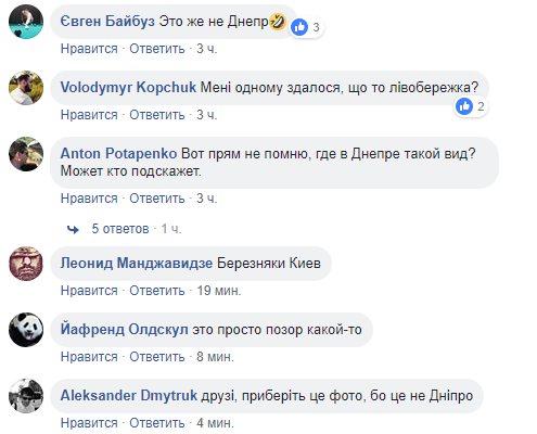 "Это ведь не Днепр", "Мне одному показалось, что это левобережка?", "Вот прям не помню, где в Днепре такой вид? Может кто подскажет", "Березняки, Киев", "Это просто позор какой-то, друзья, уберите это фото, потому что это не Днепр", - писали в сети.