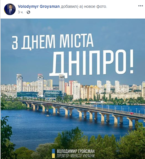 Премьер-министр Украины Владимир Гройсман поздравил Днепр с Днем города фотографией Киева.