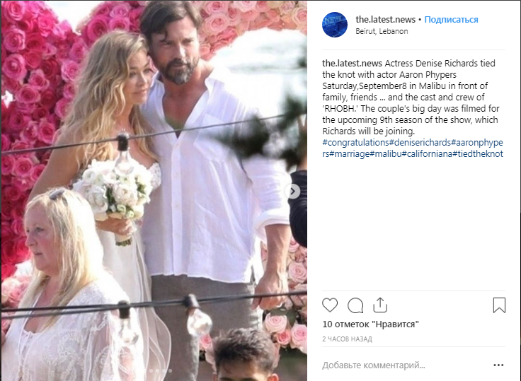 6 сентября на пляже в Малибу состоялась свадебная церемония американской актрисы Дениз Ричардс и и Аарона Файперса. Об этом сообщили гости церемонии в социальных сетях.