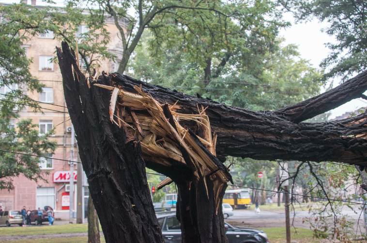 Буря в Днепре завалила деревья на дорогу, блокируя движение транспорта