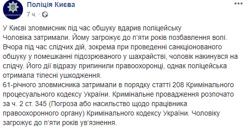 61-летнего злоумышленника задержали в порядке статьи 208 Уголовно-процессуального кодекса Украины. Уголовное производство начато по ч. 2 ст. 345 (Угроза или насилие в отношении работника правоохранительного органа) Уголовного кодекса Украины.