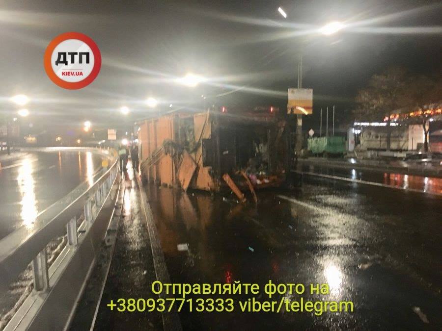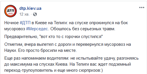 "Ночное ДТП в Киеве на ул. Телиги: на спуске опрокинулся на бок мусоровоз Mercedes. Обошлось без серьезных травм. Предварительно, "вот кто то с горочки спустился".