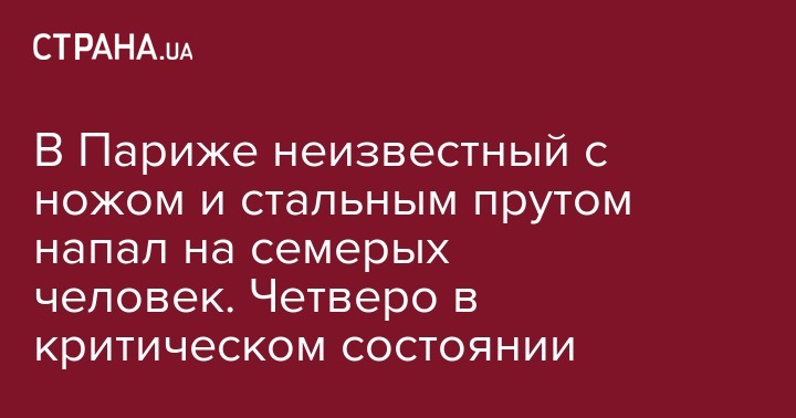 Вчера, 9 сентября, в Париже произошел трагический инцидент. Здесь неизвестный с ножом и металлическим прутом атаковал семерых человек, четверо раненых находятся в критическом состоянии. Об этом передает DW со ссылкой на AFP.