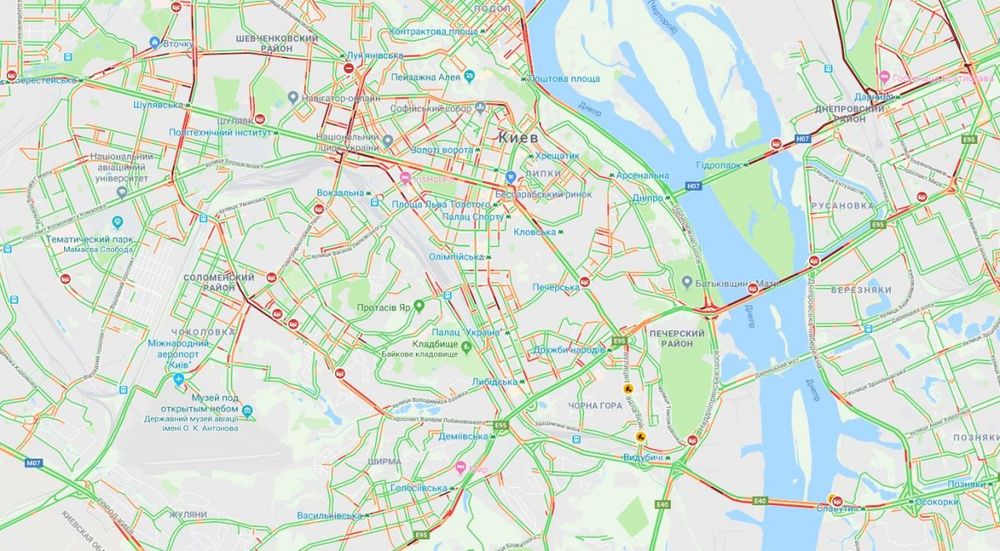Парализовано движение на улицах Гетьмана, Довженко, а также на проспекте Академика Палладина и Кольцевой дороге. Кроме того, наблюдается пробка на проспекте Победы в районе станции метро Житомирская.