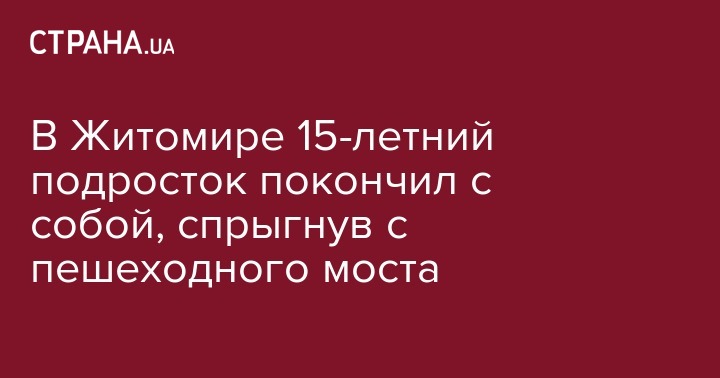 В Житомирской области подросток покончил жизнь самоубийством, прыгнув с пешеходного моста в парке. Об этом сообщил начальник Нацполиции в Житомирской области Вячеслав Печененков на своей странице в Facebook.