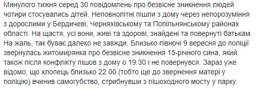 "Около полуночи 9 сентября в полицию обратилась жительница Житомира о безвестном исчезновении 15-летнего сына, который после конфликта ушел из дома в 19:30 и не вернулся", - написал Печененко.