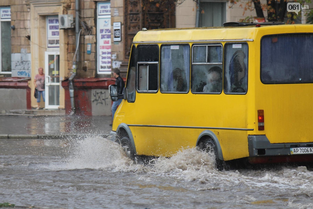 На опубликованных в сети фото видно, как автомобили "переплывают" перекресток проспекта Соборного и улицы Лермонтова. Людям, чтобы выйти из маршруток, пришлось прыгать прямо в лужи.