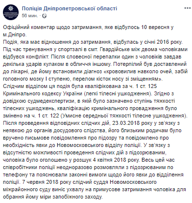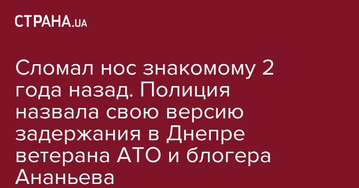 Сегодня, 11 сентября, полиция Днепропетровской области дала официальный комментарий по поводу вчерашнего задержания в Днепре ветерана АТО и блогера Валерия Ананьева. По версии полицейских, его задержали за то, что он более двух лет назад сломал нос парню, который вместе с ним тренировался в спортзале.