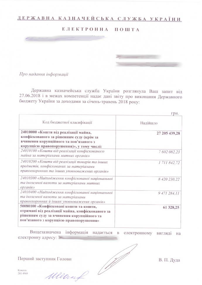Согласно финансовым документам на конец августа в бюджет поступило 65,7 тысяч гривень, конфискованных "за совершение коррупционного и связанного с коррупцией правонарушения". К концу мая эта сумма составляла 61,3 тысячи.