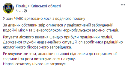 "При загадочных обстоятельствах зверь оказался в радиоактивном загрязненном водоеме между 4 и 5 энергоблоком Чернобыльской атомной станции", - сказано в сообщении полиции на странице в Facebook.
