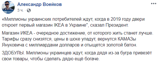 "Банковая через своих ЛОМов разгоняет радость, что в Украину приходит IKEA. Только они не уточняют, что их магазин откроется в новом торговом центре застройщика Вагифа Алиева по той же схеме, по которой в Украину пришел H&M к тому же застройщику.