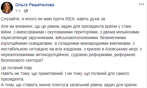 Журналистка Ольга Решетилова уверена, что открытие мебельного магазина - не уровень для президента страны.