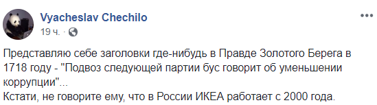 "Представляю себе заголовки где-нибудь в Правде Золотого Берега в 1718 году - "Подвоз следующей партии бус говорит об уменьшении коррупции"... Кстати, не говорите ему, что в России ИКЕА работает с 2000 года", - прокомментировал слова Уколова журналист Вячеслав Чечило.