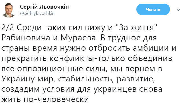"С момента создания ОБ последовательно выступает за консолидацию настоящей оппозиции. Я поддерживаю объединение со всеми политическими силами, разделяющими ценности ОБ и его избирателей: мир, единство страны, развитие демократии и экономики, свобода слова и мысли. Среди таких сил вижу и "За життя" Рабиновича и Мураева. В трудное для страны время нужно отбросить амбиции и прекратить конфликты-только объединив все оппозиционные силы, мы вернем в Украину мир, стабильность, развитие, создадим условия для украинцев снова жить по-человечески", - написал политик в Twitter.