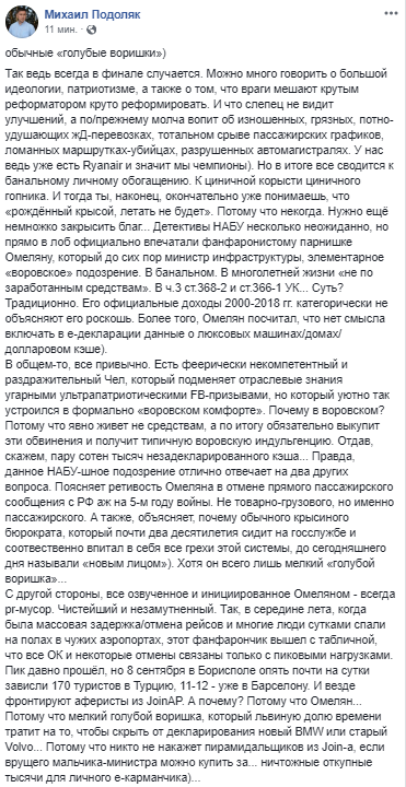 С другой стороны, все озвученное и инициированное Омеляном - всегда pr-мусор. Чистейший и незамутненный. Так, в середине лета, когда была массовая задержка/отмена рейсов и многие люди сутками спали на полах в чужих аэропортах, этот фанфарончик вышел с табличной, что все ОК и некоторые отмены связаны только с пиковыми нагрузками. Пик давно прошёл, но 8 сентября в Борисполе опять почти на сутки зависли 170 туристов в Турцию, 11-12 - уже в Барселону. И везде фронтируют аферисты из JoinAP. А почему? Потому что Омелян... Потому что мелкий голубой воришка, который львиную долю времени тратит на то, чтобы скрыть от декларирования новый BMW или старый Volvo...".