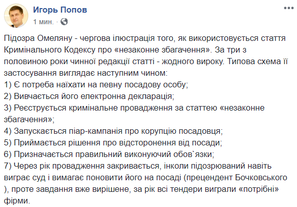 "Подозрение Омеляну - очередная иллюстрация того, как используется статья Уголовного Кодекса о "незаконное обогащение". За три с половиной года действующей редакции статьи - ни одного приговора. Типичная схема ее применения выглядит следующим образом:
