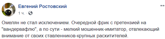 "Омелян не стал исключением. Очередной фрик с претензией на "вандервафлю", а по сути - мелкий мошенник-имитатор, отвлекающий внимание от своих ставленников-крупных расхитителей".
