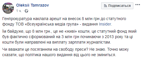 Генпрокуратура наложила арест на 8 млн гривен, которые должны были войти в уставной фонд ТОВ "Всеукраинская медиа группа" (ВМГ). Ей принадлежит интернет-издание Insider.