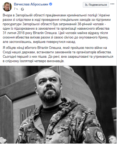Также он написал, что ранее обещал супруге Олешко найти виновных в смерти его мужа. На сегодняшний день один из заказчиков задержан, четверо исполнителей - в СИЗО.