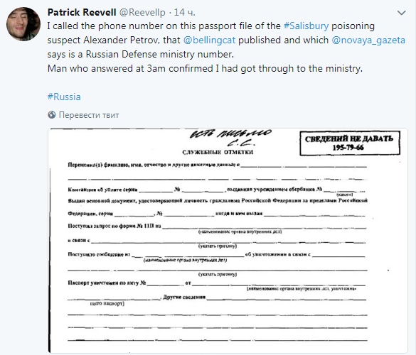Отравление в Солсбери. Журналисты позвонили на телефонный номер подозреваемого Петрова и попали в Минобороны России
