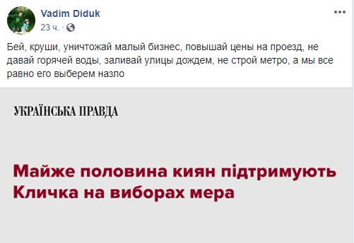 Блогер Вадим Дидук возмущается, что киевляне все равно готовы голосовать за Кличко: "Бей, круши, уничтожай малый бизнес, повышай цены на проезд, не давай горячей воды, заливай улицы дождем, не строй метро, а мы все равно его выберем назло".