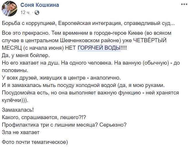 Журналистка Соня Кошкина пишет, что в Шевченковском районе Киева горячей воды нет уже четыре месяца.