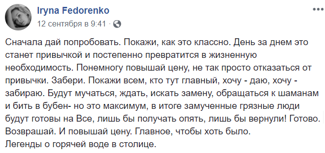 Маркетолог Ирина Федоренко считает, что перипетии с горячей водой нужны властям для того, чтобы киевляне готовы были платить за нее уже любые деньги.