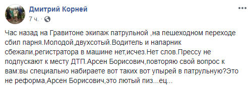 "Водитель и напарник сбежали, регистратора в машине нет, исчез. Нет слов. Прессу не подпускают к месту ДТП. Арсен Борисович, повторяю свой вопрос к вам: вы специально набираете вот таких вот упырей в патрульную?Это не реформа, Арсен Борисович, это лютый пиз@ец", - отметил Корней.