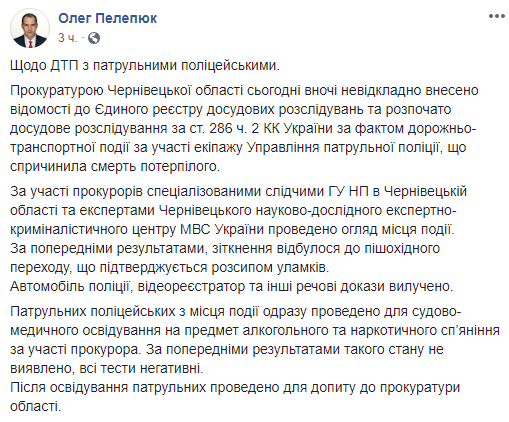 "Прокуратурой Черновицкой области сегодня ночью безотлагательно внесены сведения в Единый реестр досудебных расследований и начато досудебное расследование по факту дорожно-транспортного происшествия с участием экипажа Управления патрульной полиции, ставшего причиной смерти потерпевшего... По предварительным результатам, столкновение произошло до пешеходного перехода, что подтверждается россыпью обломков. Автомобиль полиции, видеорегистратор и другие вещественные доказательства изъяты", - сказано в сообщении.