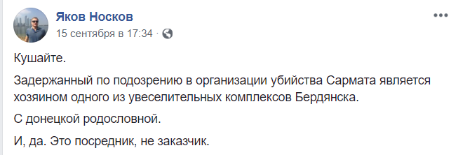 "Задержанный по подозрению в организации убийства Сармата является хозяином одного из увеселительных комплексов Бердянска. С донецкой родословной. И, да. Это посредник, не заказчик", - пишет журналист в соцсети.