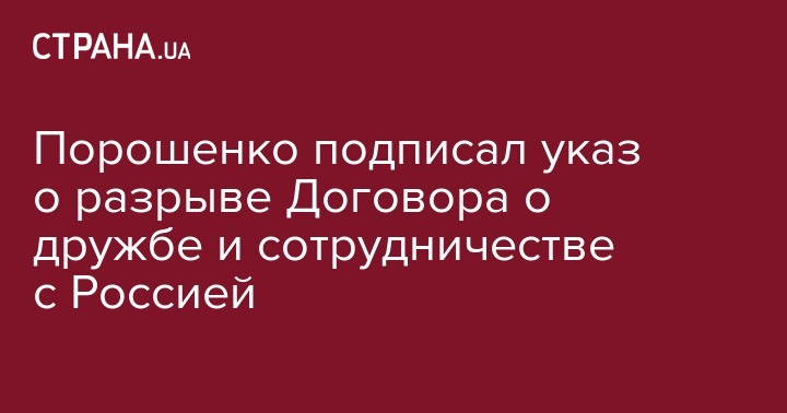 Президент Украины Петр Порошенко подписал указ о введении в действие решения Совета национальной безопасности и обороны Украины (СНБО) о разрыве Договора о дружбе, сотрудничестве и партнерстве между Украиной и Россией.