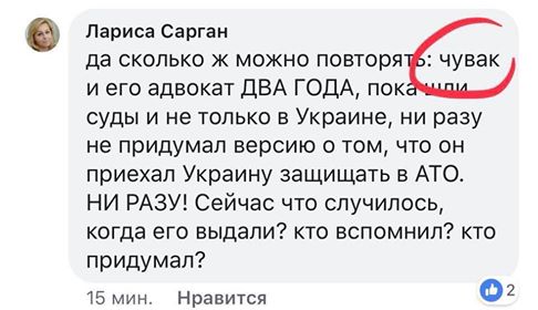 "Да сколько ж можно повторять: чувак и его адвокат ДВА ГОДА, пока шли суды и не только в Украине, ни разу не придумал версию о том, что он приехал Украину защищать в АТО. НИ РАЗУ! Сейчас что случилось, когда его выдали? кто вспомнил? кто придумал?" - не сдерживаясь, отписалась Сарган.
